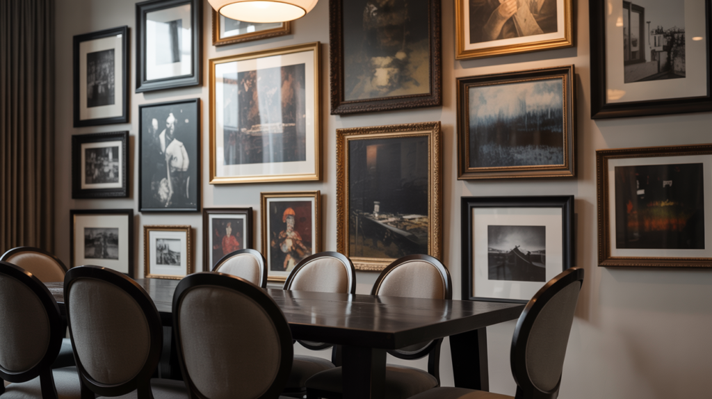 A gallery wall featuring moody artwork or photographs can add depth and visual interest to the room.