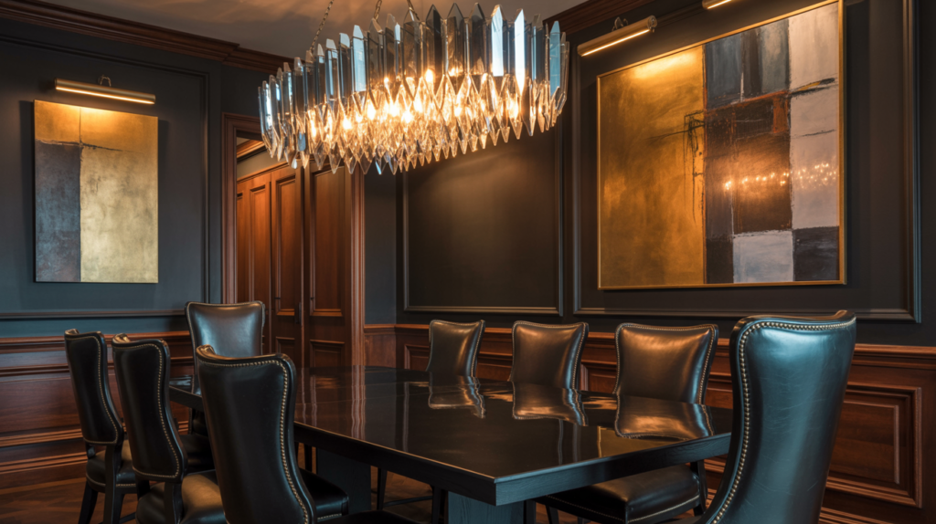 A unique light fixture can be the centerpiece of your moody dining room. Choose a fixture that complements the room’s style and adds to its drama.