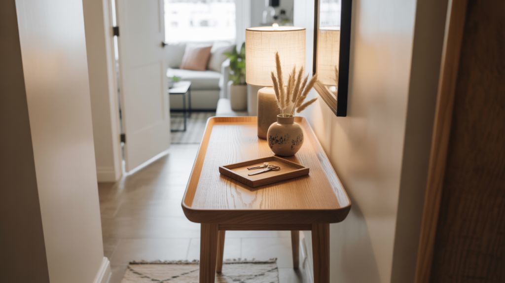 Even the tiniest hallway can benefit from the functionality and style of a console table, provided it’s chosen with deliberate care. The secret to integrating this piece into your tiny hallway ideas lies in its dimensions: think ultra-slim, minimalist designs that offer a surface without impeding traffic flow.