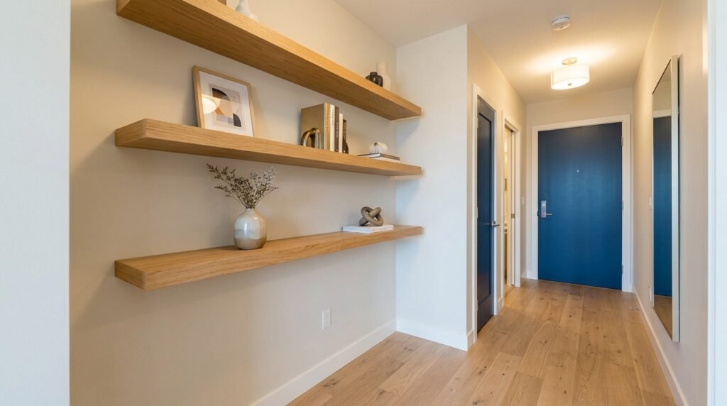 When floor space is a luxury, looking upwards is the natural solution for tiny hallway ideas, and floating shelves are an absolute game-changer. These sleek, minimalist wonders offer display and storage opportunities without encroaching on precious square footage below.