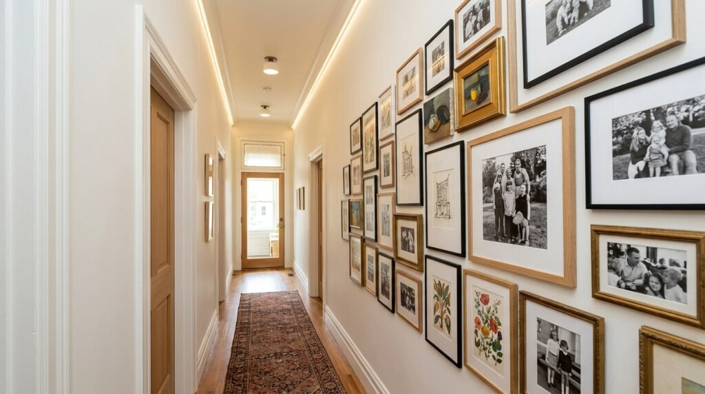 In tiny hallways, horizontal space is at a premium, making verticality your secret weapon. A thoughtfully curated gallery wall, particularly one that extends upwards, can transform a cramped corridor into an engaging art display.