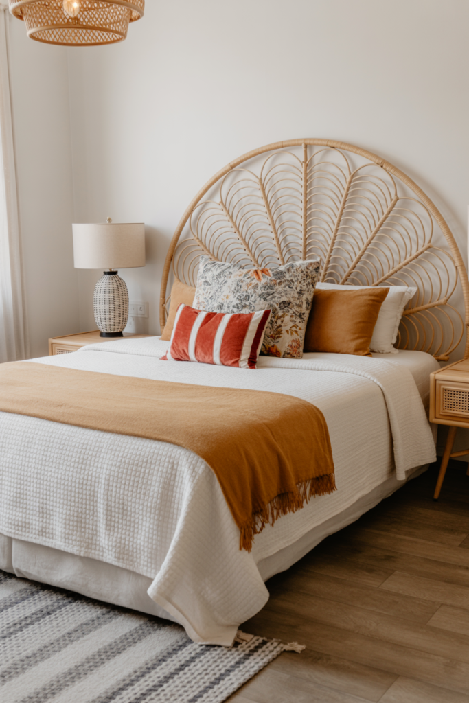 A statement rattan headboard can anchor your space and add that natural texture boho rooms thrive on. Layer it with textured bedding like cotton, linen, or something tufted, and toss on a few colorful pillows to keep it playful.