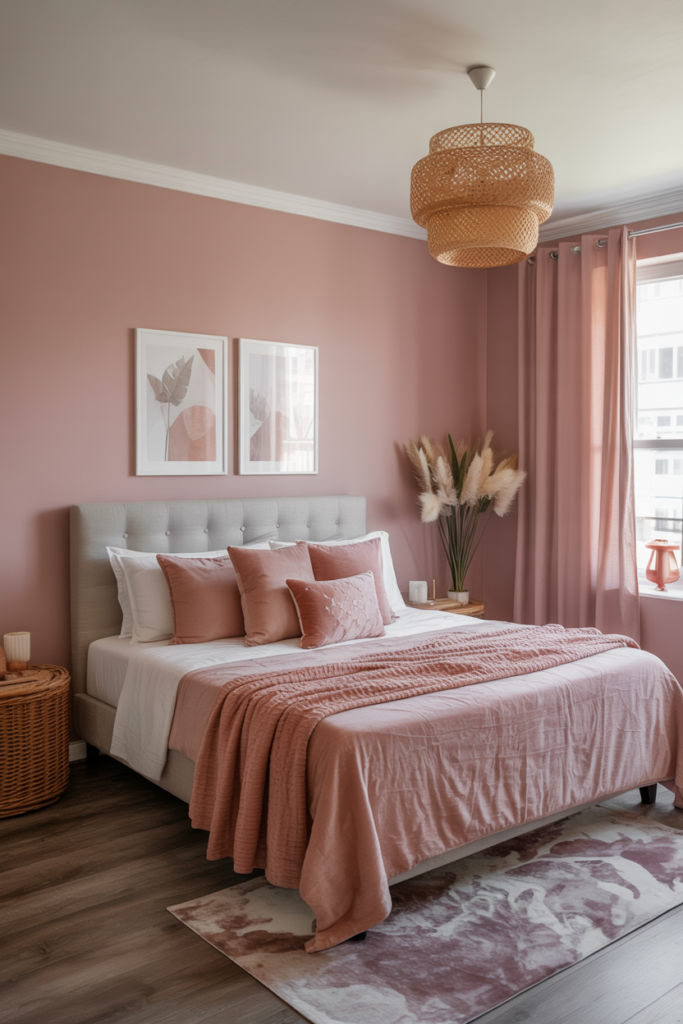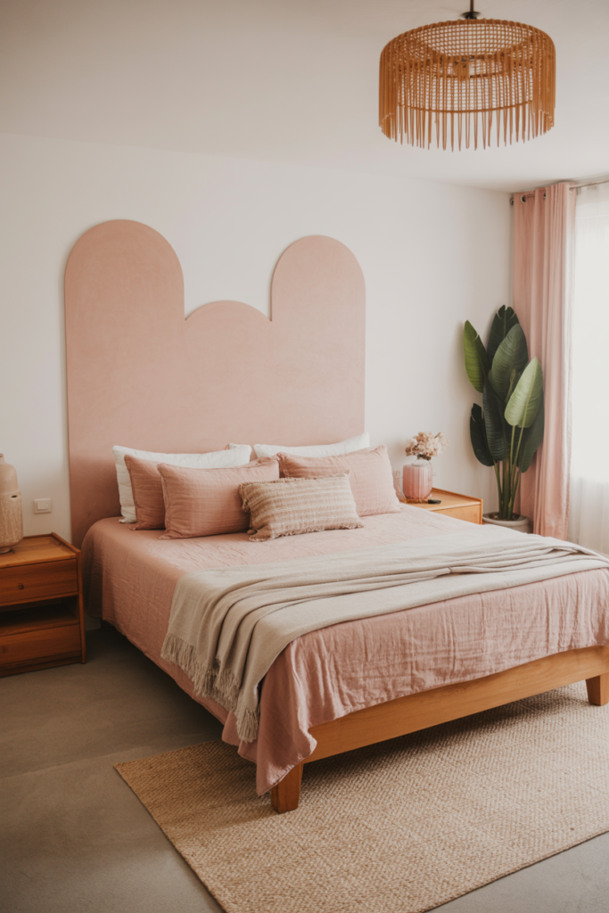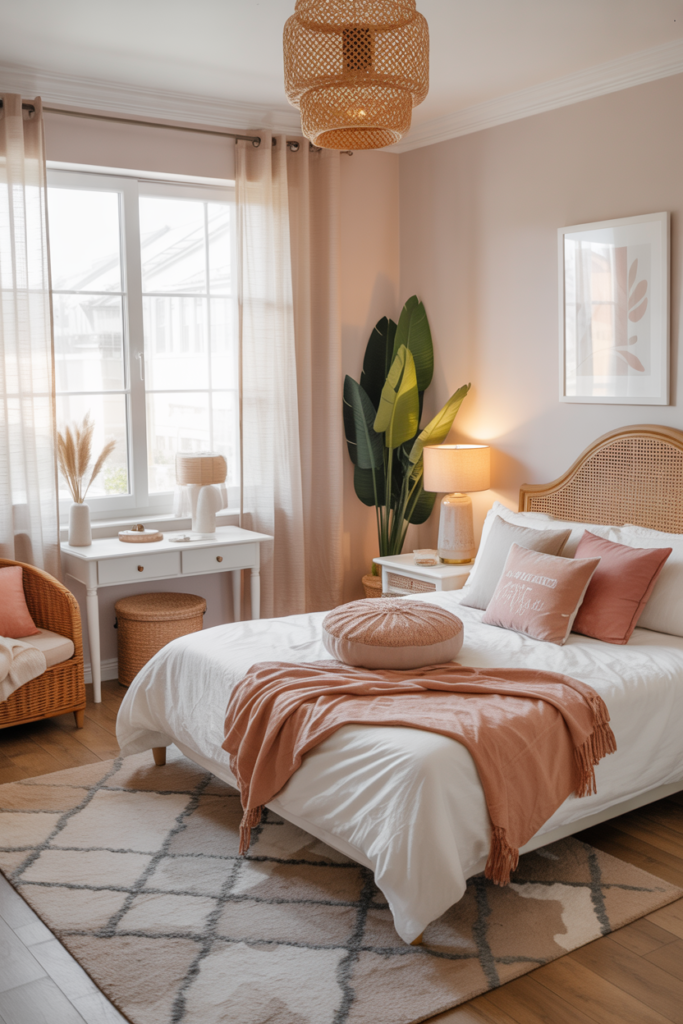 Pink isn’t just for kids’ rooms – in a boho space, it can feel soft and grown-up at the same time. Try blush or muted rose bedding with natural wood furniture for contrast, and add gold accents for a touch of polish.