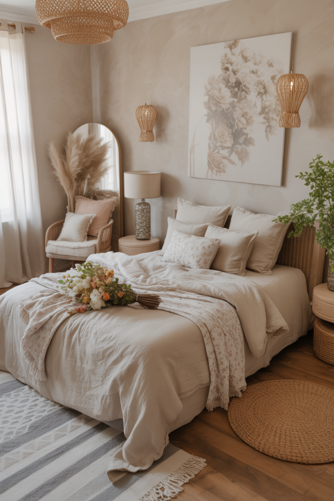 14. Romantic Boho Bedroom with Floral Details