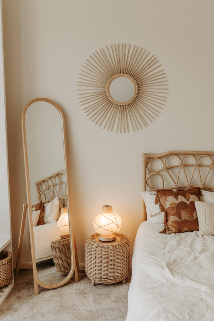 A standing mirror can be both functional and decorative. Choose one with a wood or rattan frame for boho vibes, and position it near a window for extra light.
