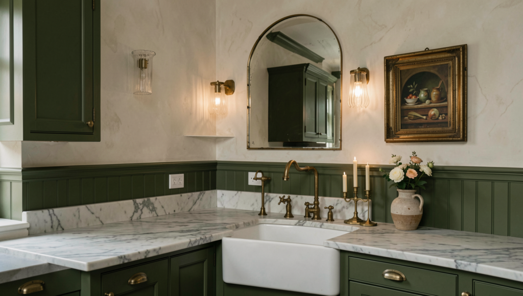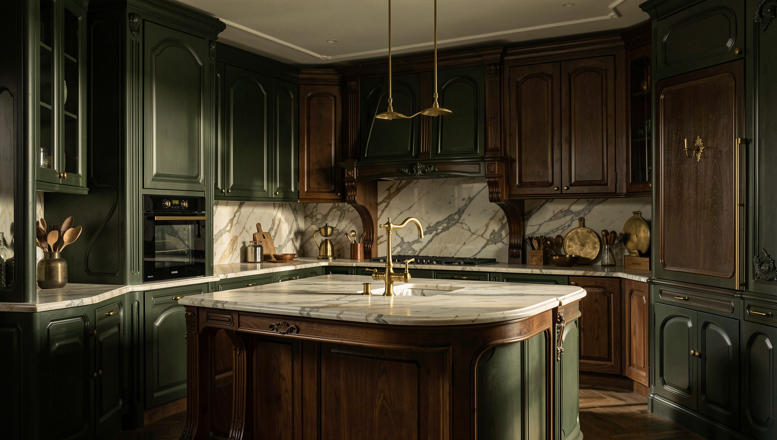 Color is the fastest way to make your kitchen feel collected, not catalog. A jewel-box approach—deep olive, aubergine, inky navy—creates chiaroscuro contrast that flatters stone, wood, and brass. It works because darker hues visually calm busy cabinetry lines and disguise daily wear, while lighter ceilings and counters keep the room buoyant.