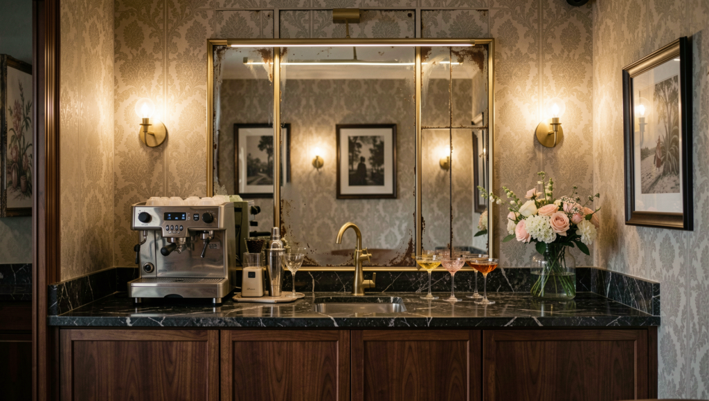 A beverage niche—coffee by morning, cocktails by night—works because it creates a dedicated ritual zone, reducing clutter everywhere else. You don’t need a full wet bar; a recessed cabinet, a slim counter, or a pantry section can become a jewel-box moment with the right styling.