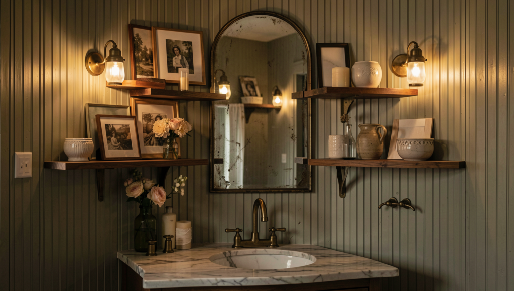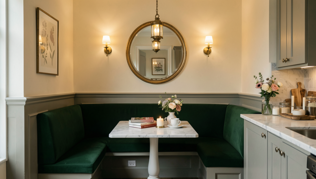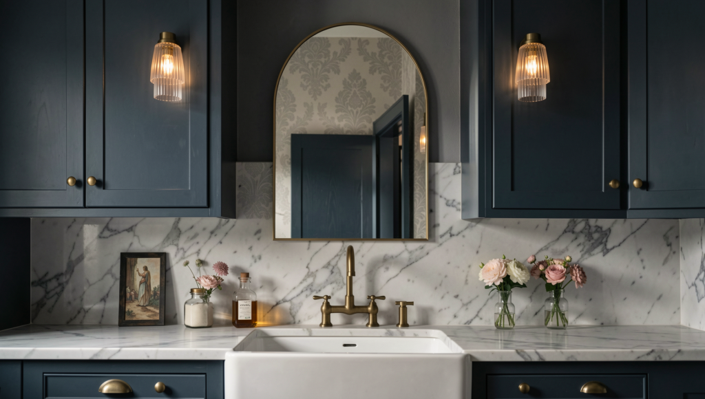 Mirrors aren’t just for powder rooms. In kitchens, antiqued glass or a mirror backsplash adds depth and doubles light, especially when you’re working with moody paint colors. It works because reflection creates visual expansion without removing a single cabinet, and antiqued finishes add softness (no harsh glare, no “gym mirror” vibe).