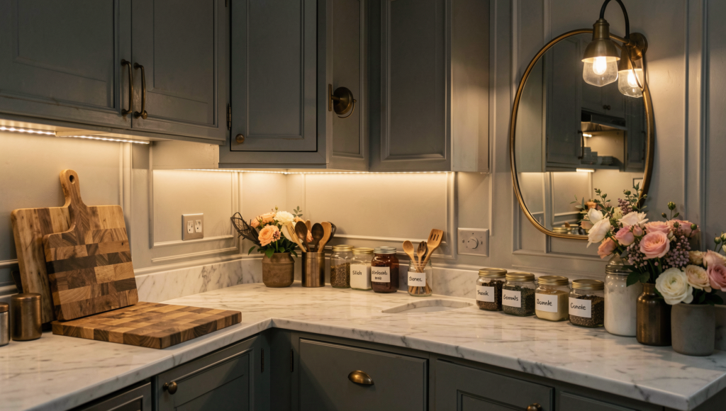 Choose sconces with character: fluted glass, aged bronze arms, linen shades for softness. Put them on dimmers—non-negotiable. Then treat under-cabinet lighting as “invisible jewelry”: warm temperature, concealed strips, no glare.