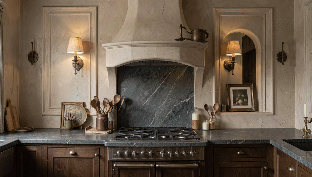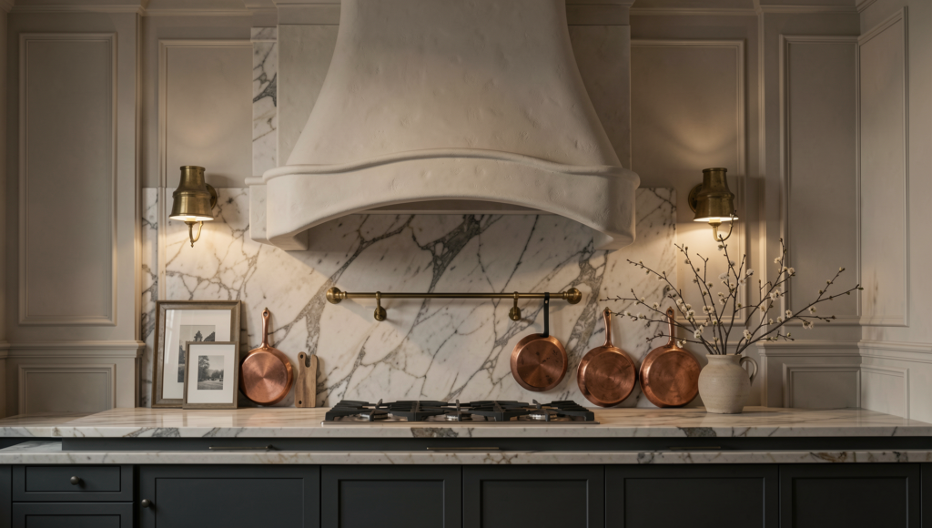 Shape matters: a soft curve nods to Art Nouveau, while a squared frame feels classic and tailored. Add a thin trim detail in brass or wood to outline the silhouette. Pair with full-height stone or tile so the hood looks integrated, not pasted on. Then light it gently—sconces flanking the range wall can feel surprisingly grand.