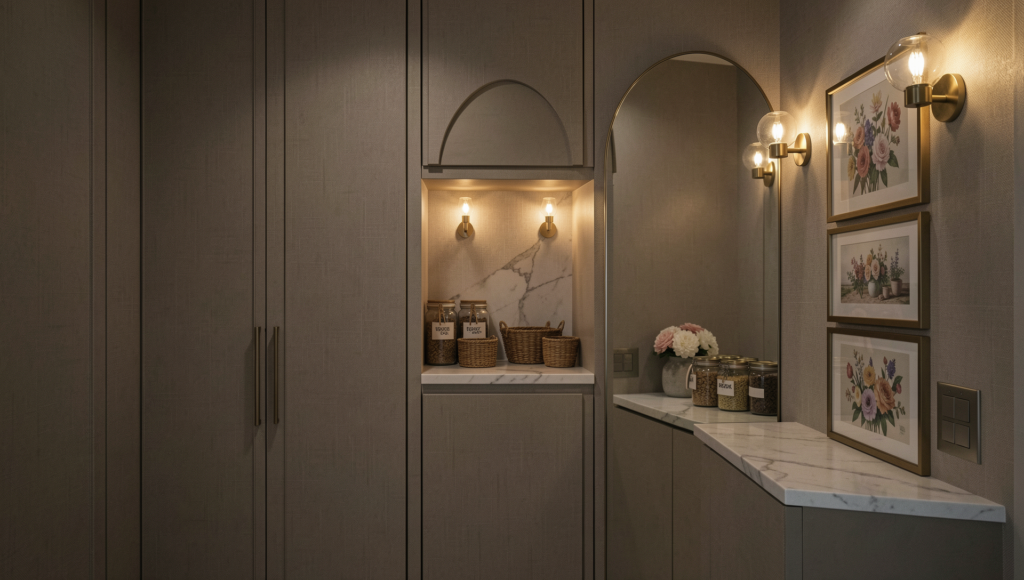 Design it like a “cabinet library.” Mix closed storage with one glass-front section for everyday ceramics. Add interior lighting so it feels boutique, not utilitarian. If space allows, dedicate a landing spot for groceries and charging devices. Choose hardware that’s comfortable in the hand—this is where you’ll feel quality most.