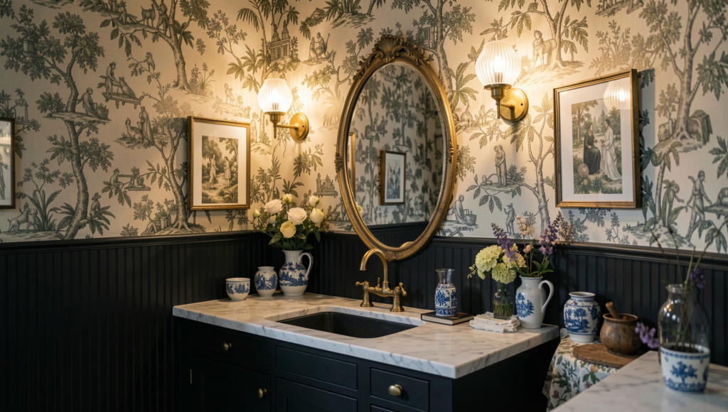 Choose a palette that echoes your cabinetry so the pattern feels tailored. Pair with warm metals (brass, antique gold) and classic lighting (glass sconces) to keep it elevated. If wallpaper feels risky, introduce pattern via upholstered stools, framed prints, or a single Roman shade.