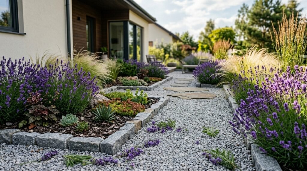 Gravel suppresses weeds, improves drainage, and reduces watering needs — making it ideal for low-maintenance homes. When paired with sculptural plants like lavender, ornamental grasses, or dwarf evergreens, the result feels intentional and beautifully structured.