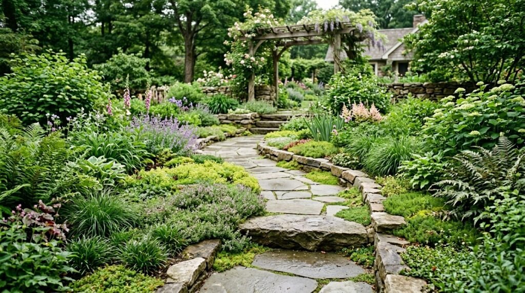 Stone paths introduce timeless charm while reducing lawn maintenance. Natural flagstone or slate pathways wind gracefully through planting beds and patios.