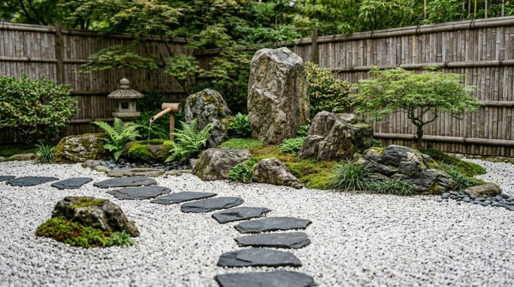 Styling Tip: Add warm outdoor lantern lighting along gravel paths for a dramatic evening glow.