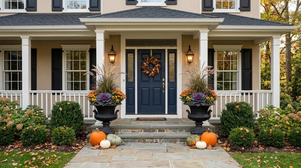 Symmetry is a powerful tool in design that immediately creates a sense of balance and formality. For a stunning fall porch, place two large, identical planters on either side of the door and fill them with a ‘thriller, filler, and spiller’ arrangement. Use tall purple fountain grass as the thriller, colorful kale and pansies as the filler, and trailing ivy or creeping Jenny as the spiller. Surround the base of these planters with perfectly matched pairs of pumpkins to reinforce the symmetrical theme. This organized approach is ideal for stately homes or for homeowners who prefer a clean, manicured look. It provides a crisp, professional appearance that enhances the architectural features of your entryway while celebrating the season.