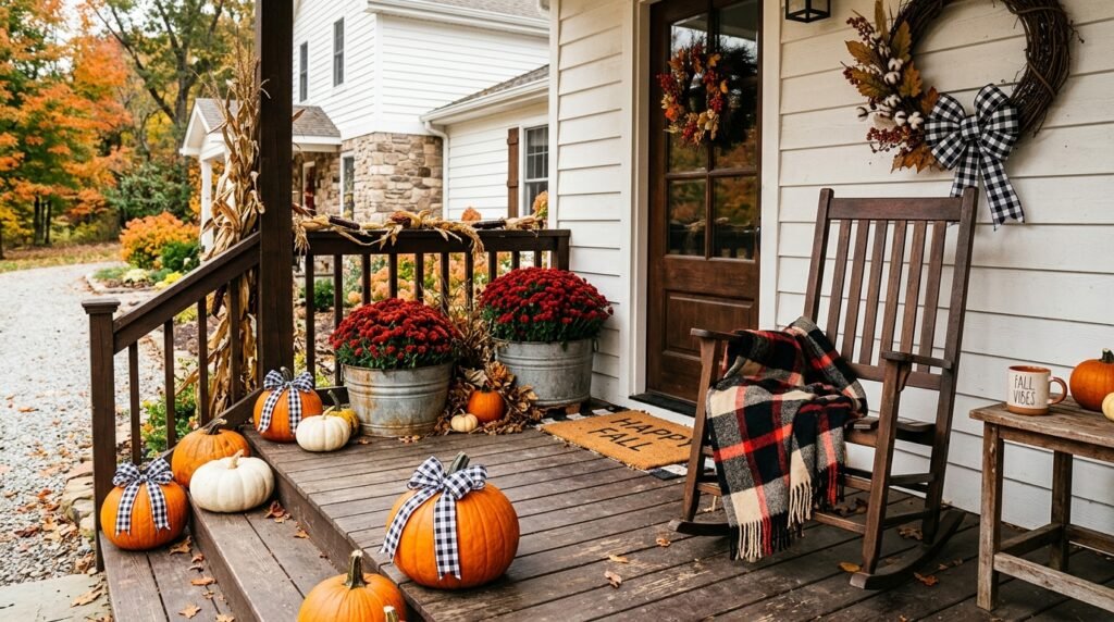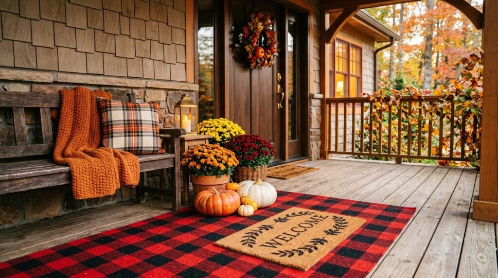 Transform your porch into a cozy outdoor room by focusing on the textures underfoot and in seating areas. Start with a large, patterned outdoor rug—such as a classic black and white plaid or a subtle stripe—and layer a smaller, textured coir doormat on top. If space allows, add a small wooden bench or a pair of rocking chairs adorned with chunky knit throws and plaid pillows. This focus on textiles makes the entrance feel warm and inviting, encouraging people to linger rather than just pass through. The combination of fabric and natural elements like pumpkins creates a tactile experience that is the hallmark of autumn comfort. It’s a simple way to add depth and a sense of ‘home’ to your exterior design.
