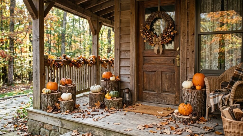 Bring the magic of a deep autumn forest to your front door by using plenty of wood, moss, and forest floor elements. Use cross-sections of tree trunks as tiered pedestals for your pumpkins, and incorporate long branches of colorful maple leaves tucked into the display. Add clusters of preserved green moss around the base of your gourds to give the impression that they are growing directly from the forest floor. A wreath made of grapevines, pinecones, and acorns completes the natural, earthy aesthetic. This look is perfect for wooded lots or for anyone who wants to lean into the more organic, wild side of fall. It feels like a miniature ecosystem that celebrates the untamed beauty of the changing seasons in a very artistic way.