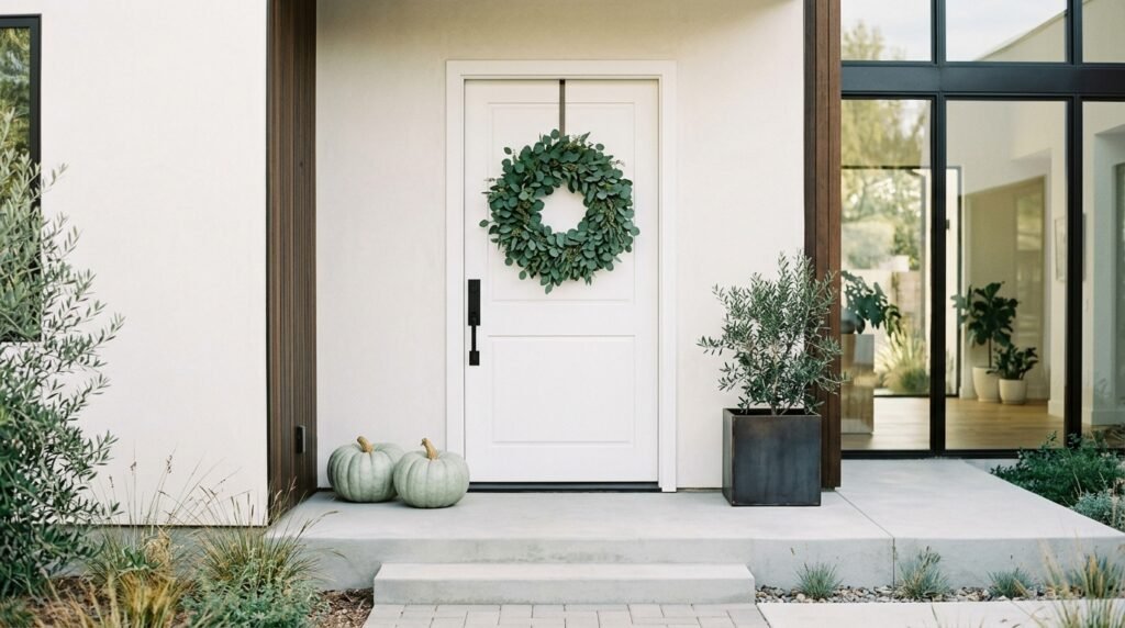 Sometimes, less is truly more, especially in a world of maximalist holiday decor. A minimalist look focuses on a single, high-quality focal point, such as an oversized, lush wreath made entirely of fresh or dried eucalyptus. The silvery-green leaves provide a sophisticated alternative to traditional fall colors and offer a beautiful fragrance every time you open the door. Pair this single statement piece with two large, architecturally interesting pumpkins at the base of the door and nothing else. This clean approach highlights the beauty of the materials themselves and the architecture of the home. It is a breath of fresh air that feels modern, intentional, and incredibly stylish without being overwhelming. Perfect for the homeowner who values simplicity.