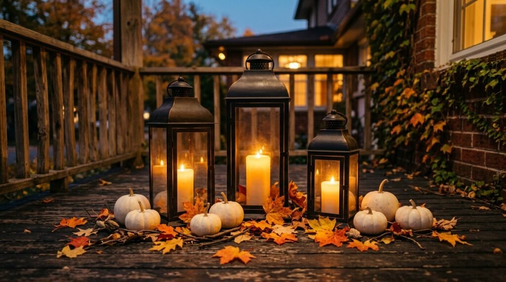 Lighting is a crucial element of fall decor, as the days grow shorter and the evenings turn cool. Use a collection of oversized lanterns in varying heights and finishes—like matte black or antiqued bronze—to line your porch steps or cluster in a corner. Fill them with large, battery-operated LED candles that feature a realistic flicker and a timer function for effortless ambiance. Surround the lanterns with a few small white gourds or a scattering of artificial fall leaves to enhance the seasonal theme. At night, the warm, golden glow creates a magical and safe pathway for visitors, while during the day, the lanterns act as substantial decorative anchors. This look combines functionality with high-level style for a truly glowing entrance.