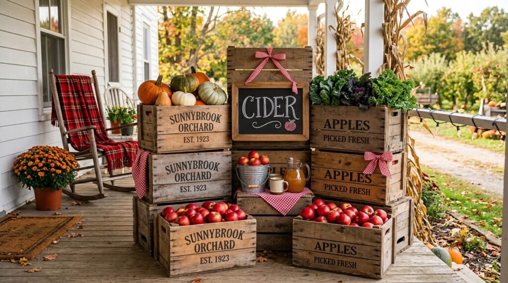 Celebrate the sweetness of the season with a decor theme inspired by a trip to the local apple orchard. Use vintage wooden apple crates stacked on their sides to hold a mix of red apples, small pumpkins, and potted kale. A large chalkboard sign leaning against the wall could feature a handwritten message like ‘Apple Cider & Hayrides’ to lean into the playful theme. Incorporate red and white gingham ribbons or fabrics to add a pop of cheerful color and a touch of farmhouse nostalgia. This look is wonderful for families and creates a sense of whimsy and fun that is perfect for the early autumn months. It’s a refreshing departure from the standard pumpkin-centric displays and offers a lovely story-driven approach to decorating.