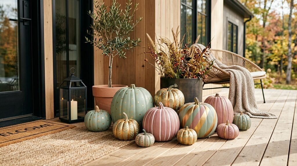 If you want a porch that stands out with personality and creativity, skip the carving and reach for the paint. Choose a cohesive color palette—perhaps pastels, jewel tones, or even bold patterns like polka dots and stripes—to decorate your pumpkins. Hand-painted designs allow you to match your decor perfectly to your home’s shutters or front door color for a custom look. You can even use stencils to add house numbers or family initials to a few of the larger pumpkins. This approach is not only long-lasting since the pumpkins aren’t cut, but it also serves as a great conversation starter for neighbors and guests. It’s an artistic, fun, and highly customizable way to show off your personal style during the fall season.