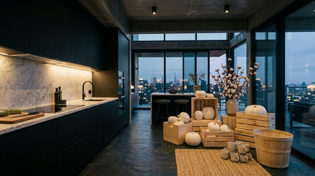 The Scandinavian design philosophy of ‘hygge’ is perfectly suited for autumn, focusing on light wood tones, natural materials, and a sense of cozy simplicity. Use light-colored wooden buckets or blonde wood crates to hold your seasonal plants and gourds. Incorporate lots of white and light grey pumpkins to keep the palette bright and airy against the wood. A simple wreath made of light-colored twigs or dried cotton bolls can add texture without adding heaviness. This look is about creating a serene and uncluttered space that feels peaceful and welcoming. It works beautifully with modern architecture or homes with a lot of natural light, emphasizing a clean connection to nature that feels both fresh and warm as the weather turns cold.