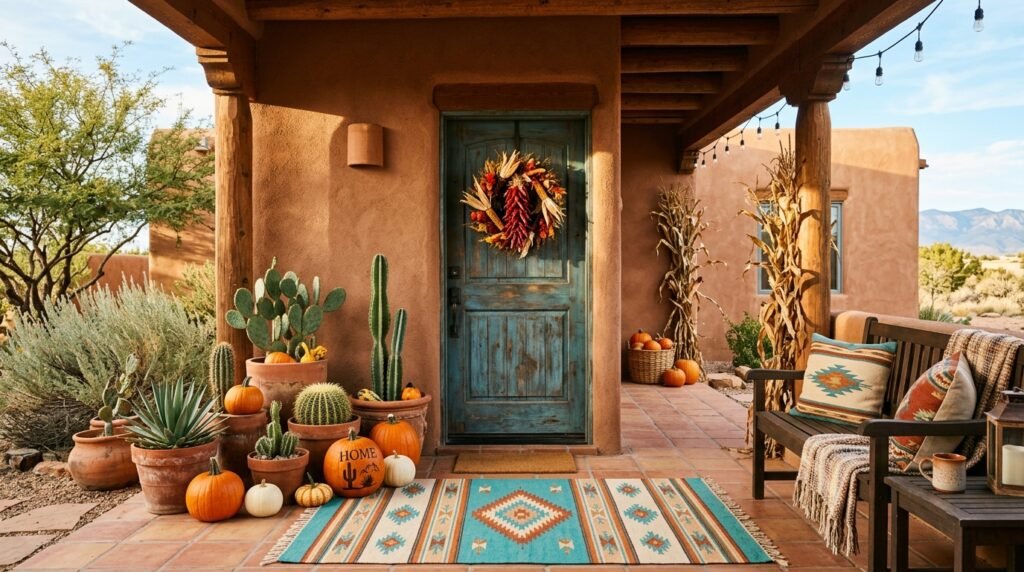 Fall doesn’t always have to look like New England; a Southwestern-inspired porch offers a beautiful and warm alternative using desert elements. Incorporate potted cacti and succulents alongside earthy, terracotta-colored pumpkins and gourds. Use woven rugs with geometric Navajo-style patterns in shades of burnt orange, turquoise, and tan to anchor the space. Dried peppers or corn husks can be used to create a unique wreath that honors the regional heritage. This look is particularly striking in sun-drenched areas where traditional fall foliage might be scarce, but the desire for seasonal change is still strong. It’s a vibrant, textured, and culturally rich approach that brings a different kind of warmth to the autumn season.