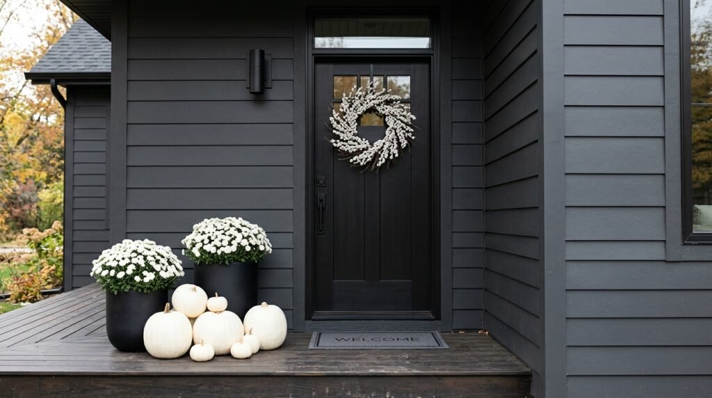 For those who prefer a clean and contemporary aesthetic, a monochromatic white theme offers a striking contrast against darker home exteriors. Focus on using exclusively white pumpkins, bleached wheat stalks, and white chrysanthemums housed in sleek black or galvanized metal planters. This high-contrast look is incredibly chic and stands out beautifully during the shorter days of autumn. You can add texture by using white-washed wooden crates to elevate some of the pumpkins, creating a multi-dimensional display that doesn’t feel flat. The key is to vary the sizes and shapes of the white elements to keep the eye moving. This minimalist approach proves that fall decor doesn’t have to be loud to be powerful and welcoming.