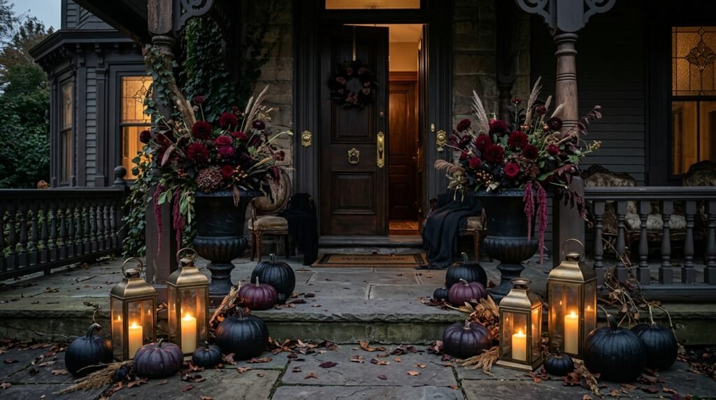 Step away from the bright and sunny side of fall with a moody, sophisticated palette that leans into deep purples, burgundies, and blacks. Use dark-hued pumpkins like the ‘Black Futsu’ or simply paint craft pumpkins in matte charcoal and deep plum finishes. Incorporate dried, dark florals such as black calla lilies or deep red celosia in heavy stone urns to add a sense of drama and mystery. This look is perfect for those who want to celebrate the transition into the darker months with an elegant, slightly gothic flair. Accent the space with antique brass lanterns containing flickering flameless candles to provide a hauntingly beautiful glow at night. It is a bold choice that transforms your entryway into a captivating and artistic statement piece