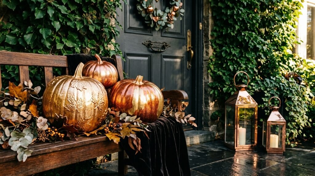 Elevate your outdoor space by introducing metallic finishes that catch the low autumn sun and provide a sense of luxury. Spray paint a few select pumpkins in shimmering gold or warm copper to act as focal points within a larger display of natural gourds. Use copper-finished lanterns and gold-toned hardware on your wreath to tie the metallic theme together seamlessly. This look works exceptionally well when paired with deep green foliage or dark navy exteriors, as the metals provide a brilliant, glowing contrast. The inclusion of metallic elements adds a sophisticated ‘jewelry’ effect to your porch, making it feel polished and high-end. It is a simple yet effective way to transition your decor from casual to formal for the holiday season.