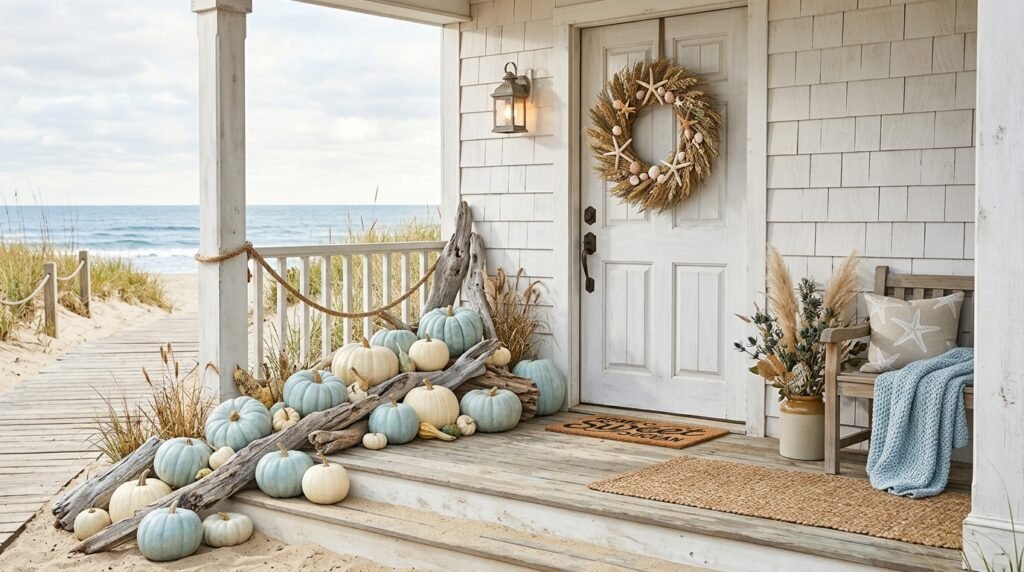 For homes near the water or for those who simply love a seaside aesthetic, fall decor can be adapted with a coastal twist. Replace traditional oranges with soft blues, teals, and sandy beiges by using painted pumpkins and naturally blue Hubbard gourds. Incorporate elements like weathered driftwood, nautical rope, and even white-washed lanterns to maintain that beachy feel. A wreath made of dried seagrass and small white starfish can offer a unique seasonal greeting that feels true to the coastal environment. This look is serene and calming, proving that you don’t have to sacrifice your personal style to celebrate the harvest season. It brings a fresh, breezy perspective to autumn that is both unexpected and deeply charming.