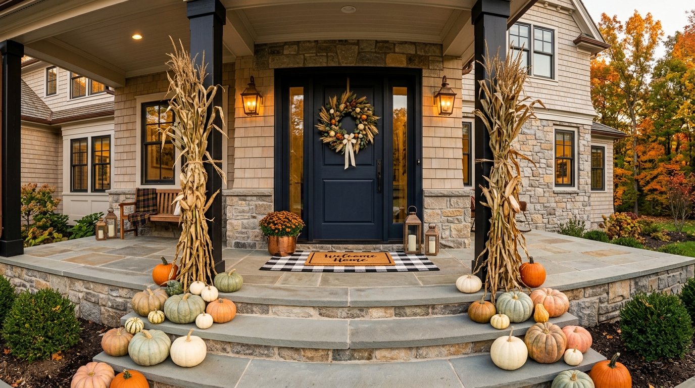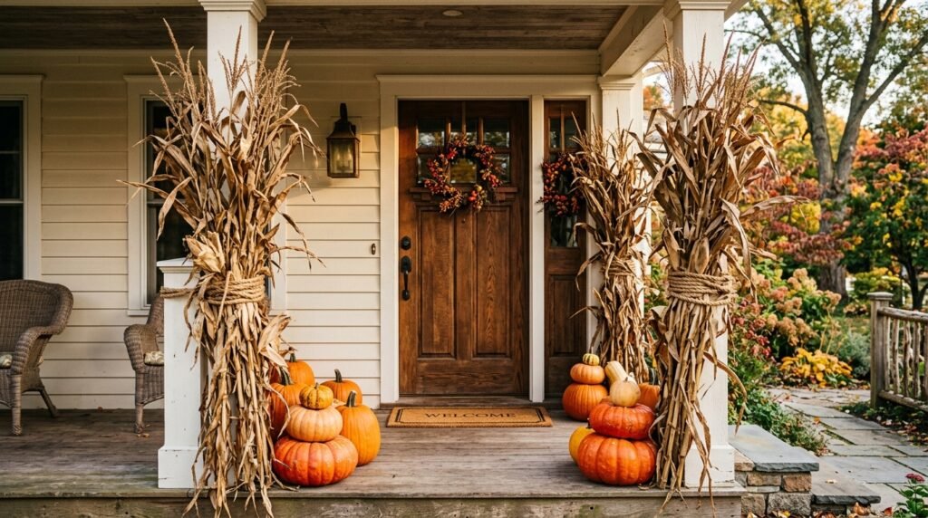 Create a sense of grand architecture by using tall, dried cornstalks as vertical pillars on either side of your entrance. This classic look adds height and drama to even the smallest of porches, making the doorway feel more significant and framed. Secure the stalks with wide plaid ribbons or thick manila rope for an extra layer of rustic detail. At the base of the stalks, pile up large, classic Jack-o’-lantern pumpkins and smaller ornamental gourds to ground the vertical lines. This time-honored tradition evokes the feeling of a bountiful harvest and historical autumn celebrations. It is a sturdy, weather-resistant design that looks just as good in early September as it does on Thanksgiving morning.