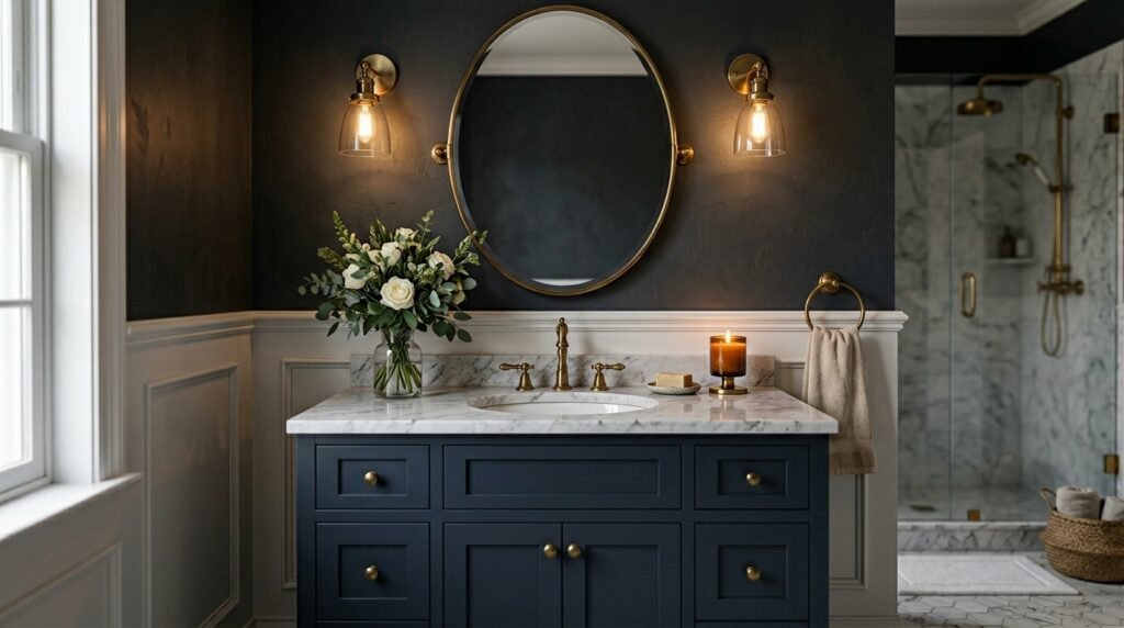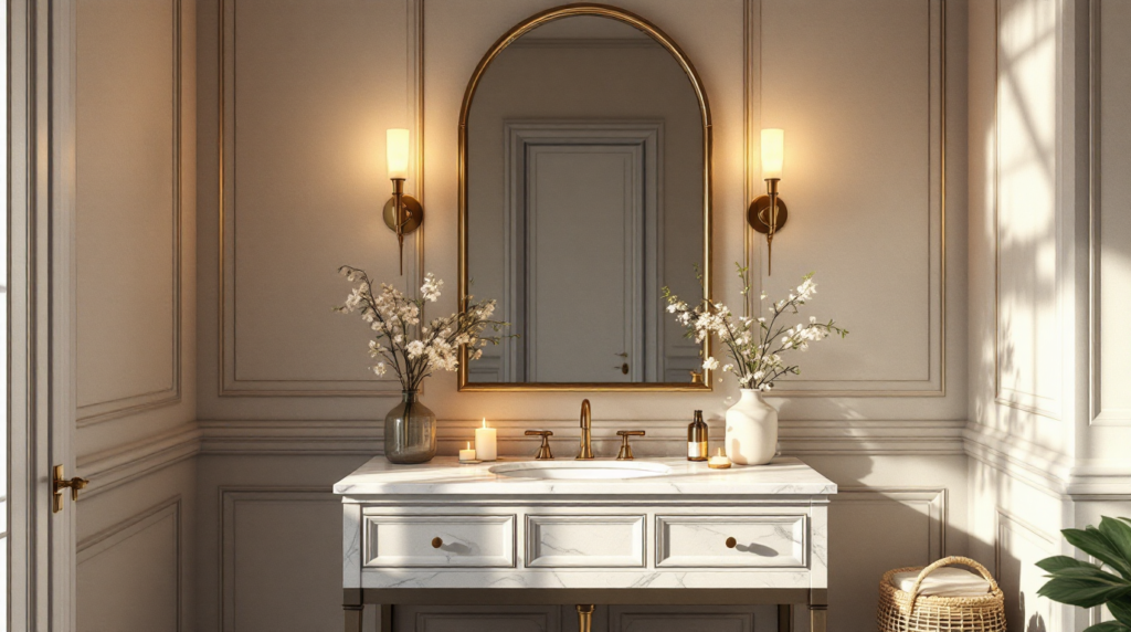 Oversized mirrors with ornate frames instantly elevate bathroom design. Choose gilded frames, antique finishes, or modern arched mirrors depending on your aesthetic.