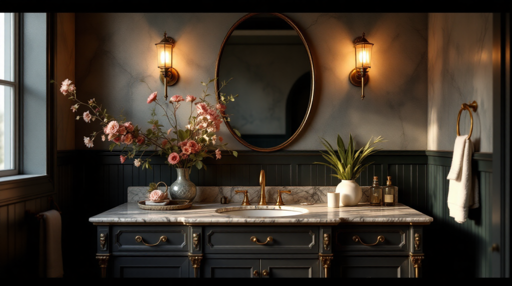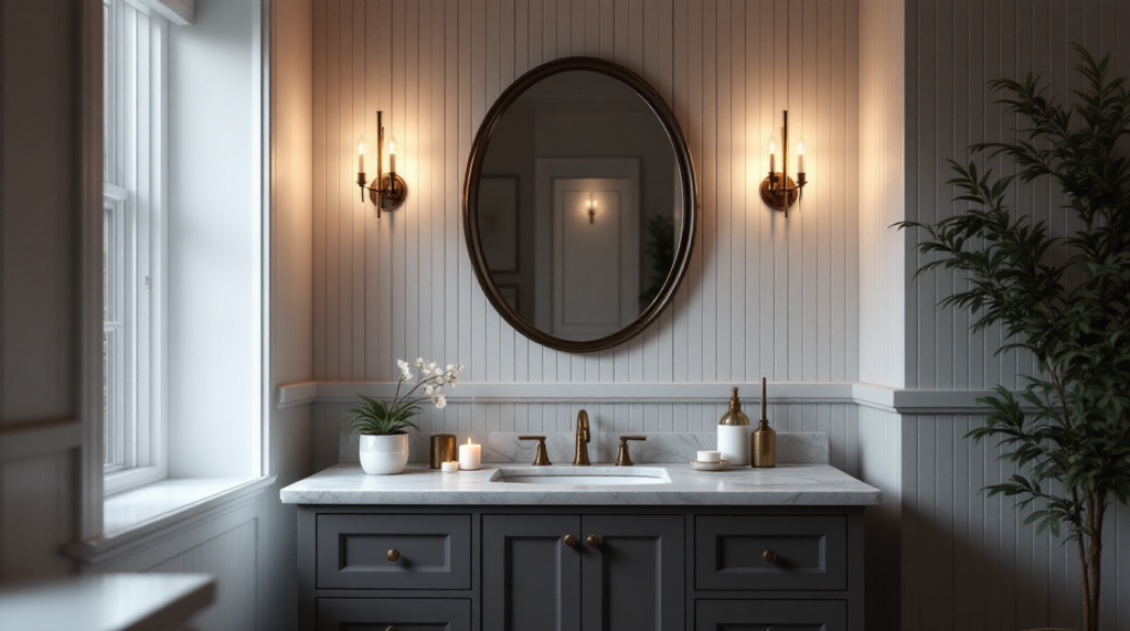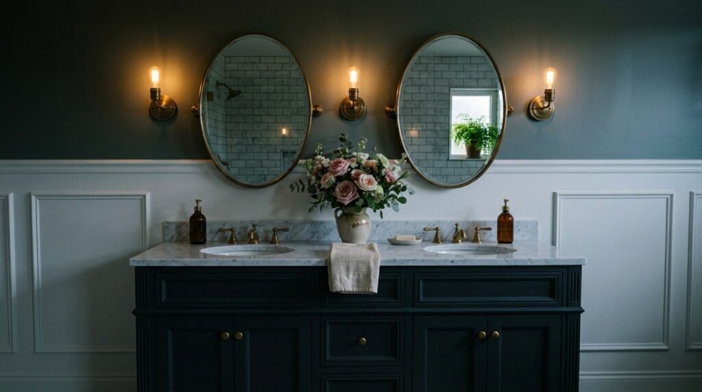 Wall sconces beside mirrors create flattering lighting while adding decorative charm.