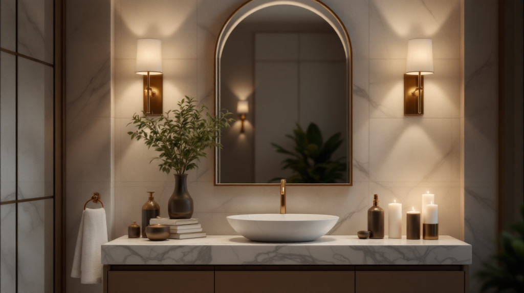 Styling Tip: Keep vanity accessories minimal to maintain visual calm.