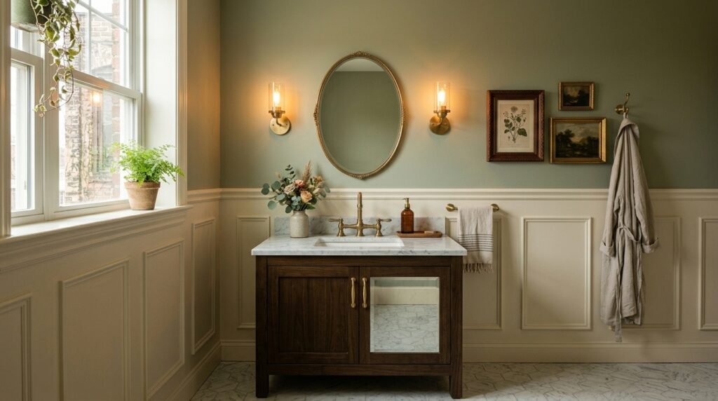 Painted in soft neutrals—cream, sage, or pale gray—wainscoting pairs beautifully with marble floors and vintage lighting. The contrast between paneling and smooth painted walls above creates a layered look reminiscent of classic European interiors.