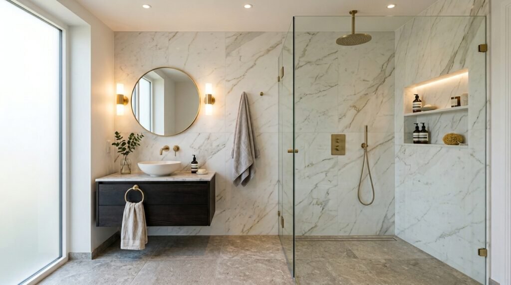 Use large marble or stone tiles inside the shower to maintain continuity with the rest of the room. Built-in niches keep toiletries organized without clutter.