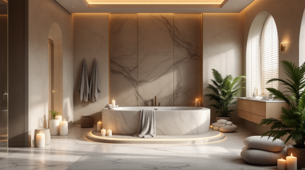 Stone walls introduce raw elegance and timeless durability. Limestone or travertine creates a serene, spa-like environment.