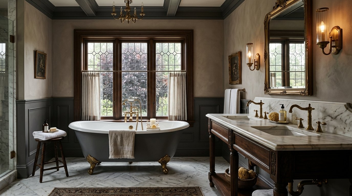 Think of the bathroom as a jewel box of the home. Rich textures like beadboard paneling, veined stone, and vintage-inspired fixtures transform an everyday routine into a ritual. The most successful designs balance classic architecture with modern practicality—pairing Victorian elegance with contemporary comfort.