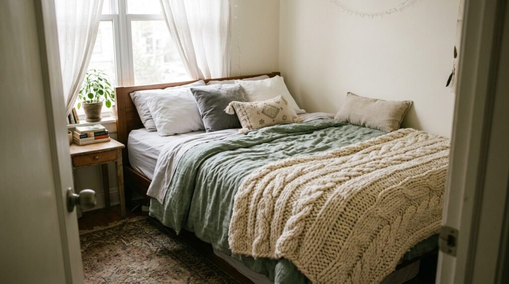 Layering a variety of textures adds depth and warmth to the space. Focus on textiles, combining smooth sheets with tactile linens and chunky throws.