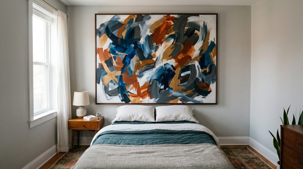 A single, oversized piece of art creates a confident and dramatic focal point, drawing the eye and adding a sense of scale to the room.