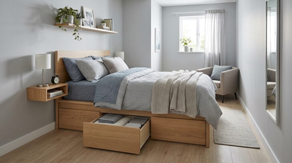 Reclaiming the space beneath your bed is a game-changer for keeping a small bedroom tidy. Invest in storage containers or a bed frame with built-in drawers.