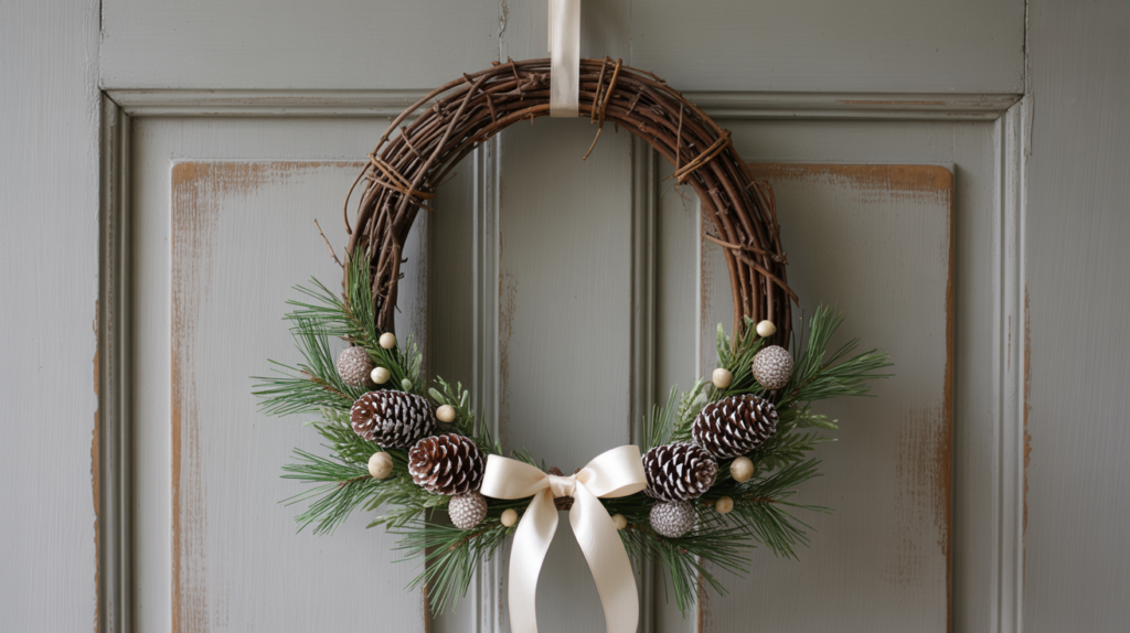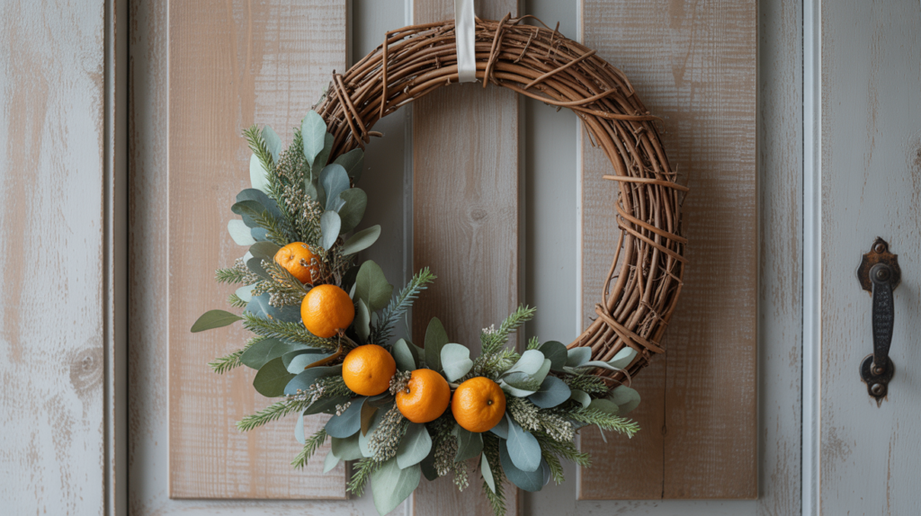 A grapevine wreath brings a nature-inspired texture that creates a relaxed porch vibe and fits beautifully with broader winter decor ideas. You can keep it simple with greenery, or tuck in dried oranges and pinecones.