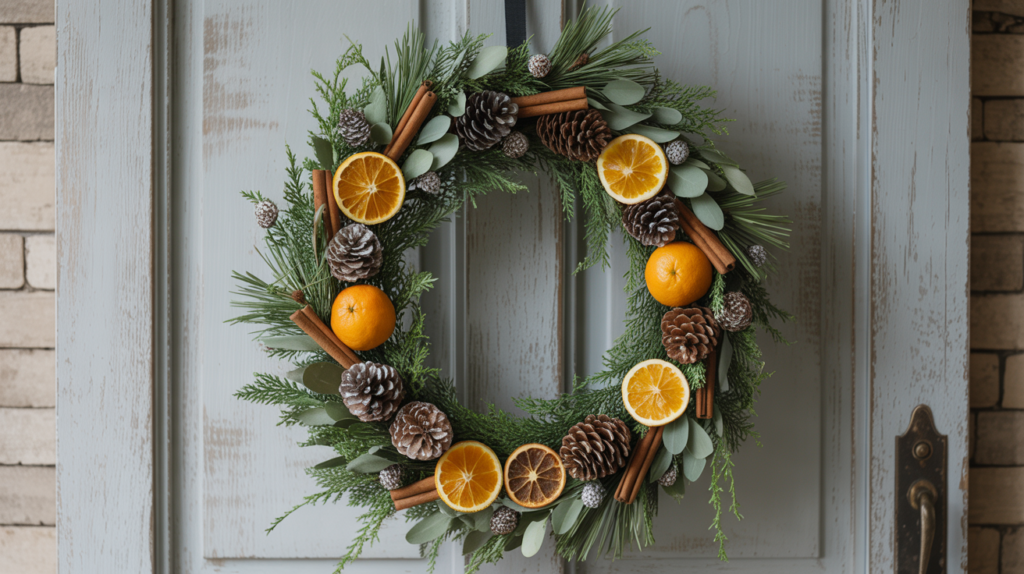 A mix of evergreens, pinecones, dried oranges, and cinnamon sticks creates a warm rustic look that feels right at home in winter. Magnolia leaves or eucalyptus branches add a softer touch.