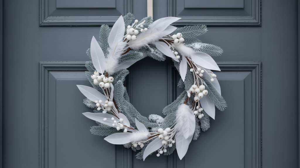 Minimalists will love this. White berries, snow-dusted leaves, and pale feathers create a beautiful texture that looks especially striking against darker doors.