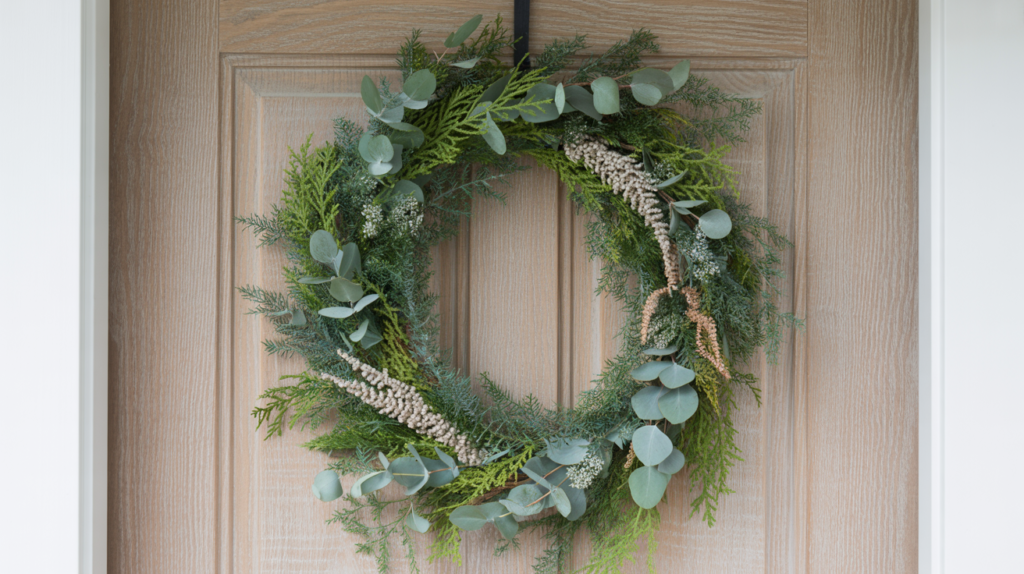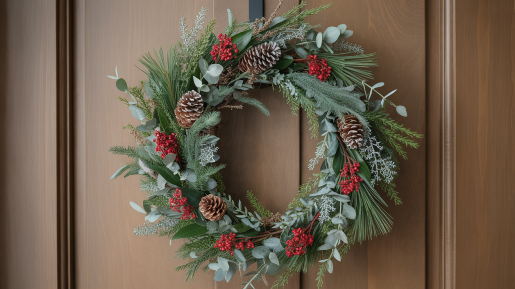Winter berries bring beautiful contrast to a wreath, especially when mixed with layered greenery. They add color and texture in a way that still feels seasonal. Evergreens, eucalyptus, and pinecones help everything stay balanced.