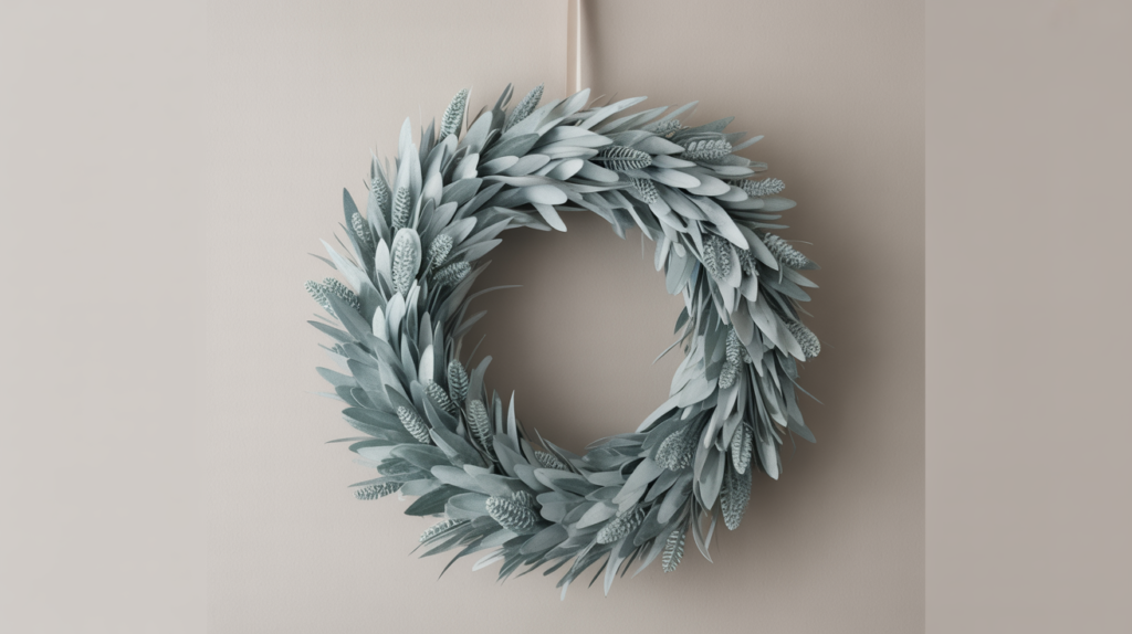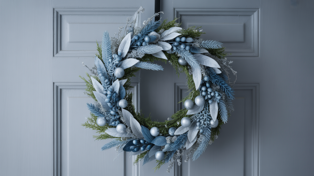Icy greenery, silver accents, and muted blue touches create a calm winter palette that feels serene after the holidays. Dusty blue ribbon or soft frosted branches help bring gentle depth.