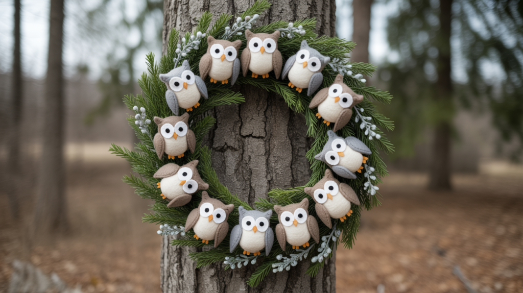 Tiny felt or wooden owls tucked into greenery create a cozy woodland look. You can perch them on faux branches or settle them into foliage. This wreath is perfect for those who love wildlife and the outdoors.
