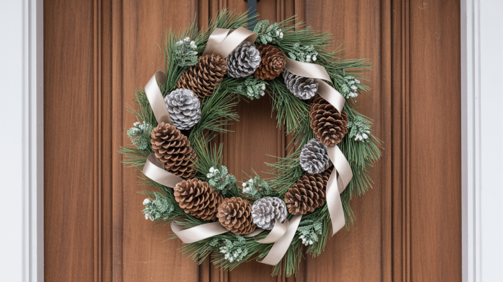 Combine pinecones and ribbons for a textured and interesting wreath. This look is perfect for those who love the outdoors and want to bring a piece of nature to their door.